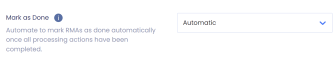 Auto-Mark as Done is a policy rule setting that automates marking a return request as Done once all required actions in the RMA are completed, based on the conditions and schedules you define.