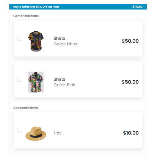 - Based on the previous example, if the customer returns one shirt while keeping the hat, they will no longer be eligible for the discount since the minimum requirement of buying 2 shirts is no longer met.