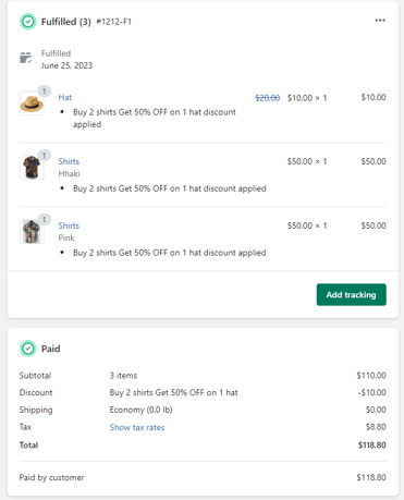 Let's revisit the previous example of the BxGy discount: buy 2 shirts, get one hat. If the customer returns one shirt while keeping the hat, they break the discount. In this case, the system will calculate the amount of $10 (the discount value of the hat) that needs to be deducted from the refund value of the returned shirt.