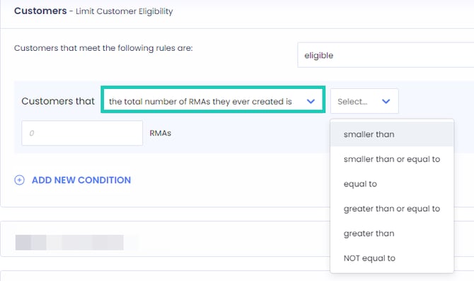 - Define an eligibility limit based on the total number of RMAs that a customer has created.