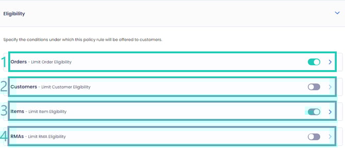 Eligibility conditions are return policy rule properties that define which customers, orders, or items within an order are eligible to be returned.