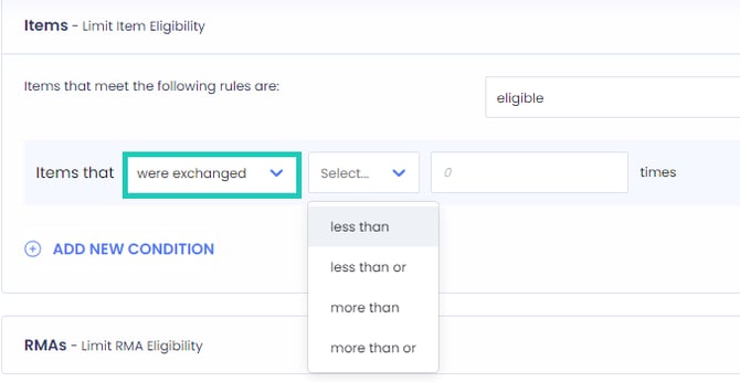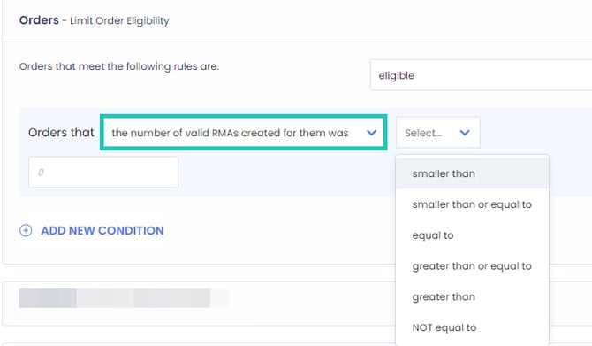- Define an eligibility limit based on the amount of RMAs the customer has created for the order.