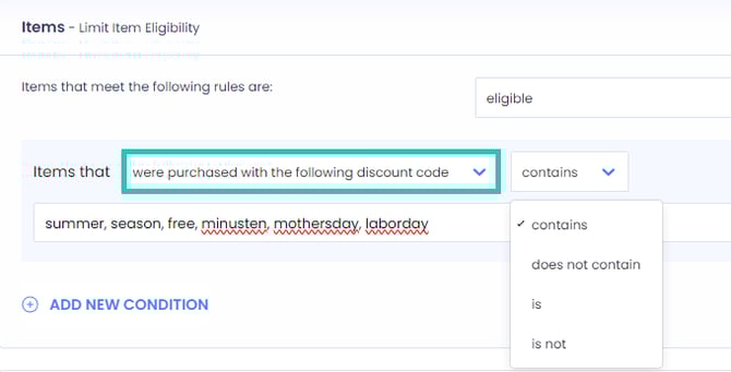- Define an eligibility limit based on the payment type that was used or whether the order was paid for with or without store credits or gift cards.