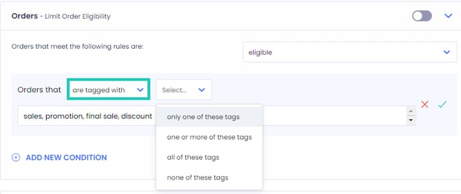 - Define a list of order-level tags to use for the eligibility condition.