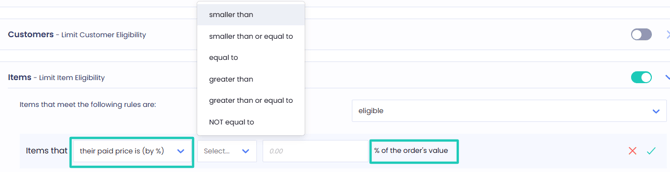 - Define eligibility based on the value of the item in relation to the order value.