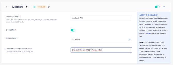 Note: In Mintsoft, under Settings > Client User Settings, search for the client that generated the key. Then click Actions > Set API Key to Never Expire. Otherwise, you will be required to reestablish the connection every 24 hours.