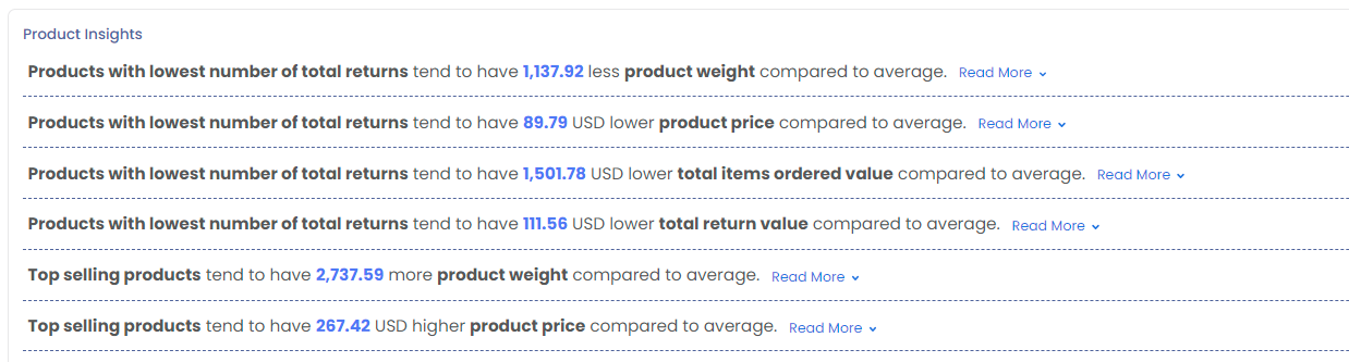- What are the top return reasons? This provides an indication of why customers are exchanging products, which provides additional data that can be used to optimize products and variants.