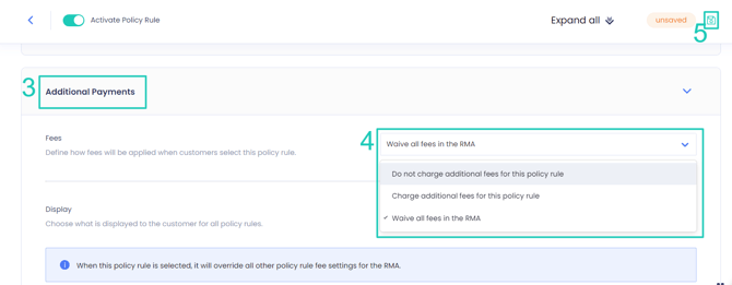 - Display: Choose how the portal will display that all fees are waived when this policy rule is selected.