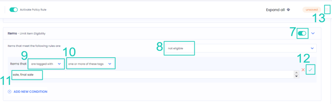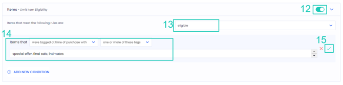 9. Set the item eligibility to be based on are tagged with or were tagged at the time of purchase with.
