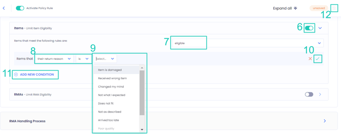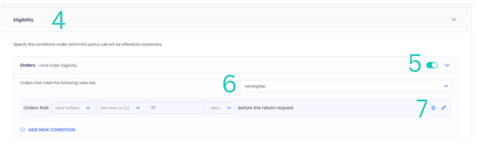 11. Click ADD NEW CONDITION if you want to add another return reason that will be eligible for this resolution.