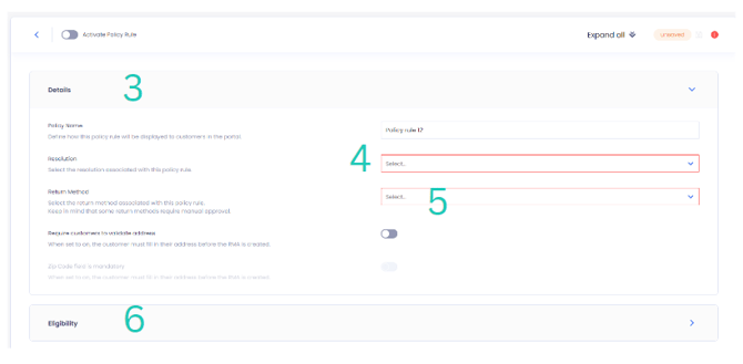 To do this, create different policy rules for free shipping and for paid return shipping. Then set eligibility conditions for products or customer locations to determine which qualify for free shipping and which qualify for paid shipping.