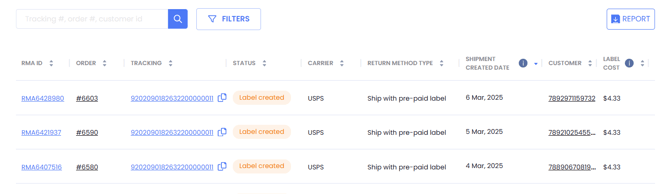 On the Return Shipments page, you can track all the labels and view a detailed breakdown, including individual costs and service levels used.