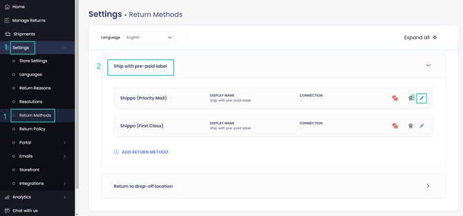 - Click the pencil icon next to the return method you want to edit.