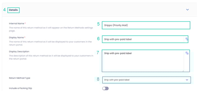 The Ship with pre-paid label return method enables you to send a pre-paid label to your customers that they can use to ship their items back.