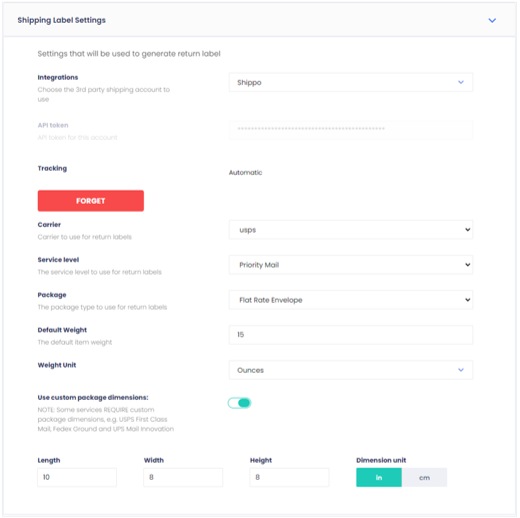 9. Toggle Generate Forward Shipping Labels to generate the return label as a regular shipping label (this is relevant if you’re using a carrier or level that doesn’t offer dedicated return labels).